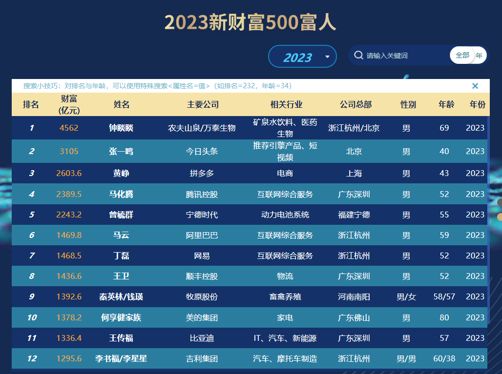 榜单显示,农夫山泉创始人钟睒睒以4562亿元财富成为第一名,较第二名今日头条张一鸣财富的3105亿元多出1457亿元。值得一提的是,这是钟睒睒连续第三年夺冠,但今年其财富较2022年的4983.5亿元下降了421.5亿元。