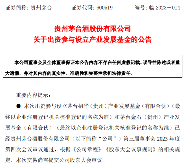 公告显示,贵州茅台方面表示,为了提升资金收益率,为全体股东创造价值,公司拟出资参与设立两只产业发展基金,分别是茅台招华(贵州)产业发展基金(有限合伙)(以下简称“茅台招华基金”)和茅台金石(贵州)产业发展基金(有限合伙)(以下简称“茅台金石基金”)。