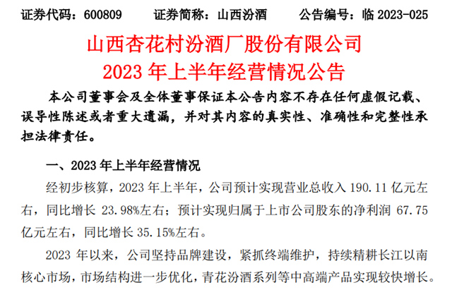 大公快消讯 7月24日傍晚,山西汾酒发布关于2023年上半年的业绩预告。经初步核算,今年上半年,公司预计实现营业总收入190.11亿元左右,同比增长23.98%左右;归属于上市公司股东的净利润67.75亿元左右,同比增长35.15%左右。