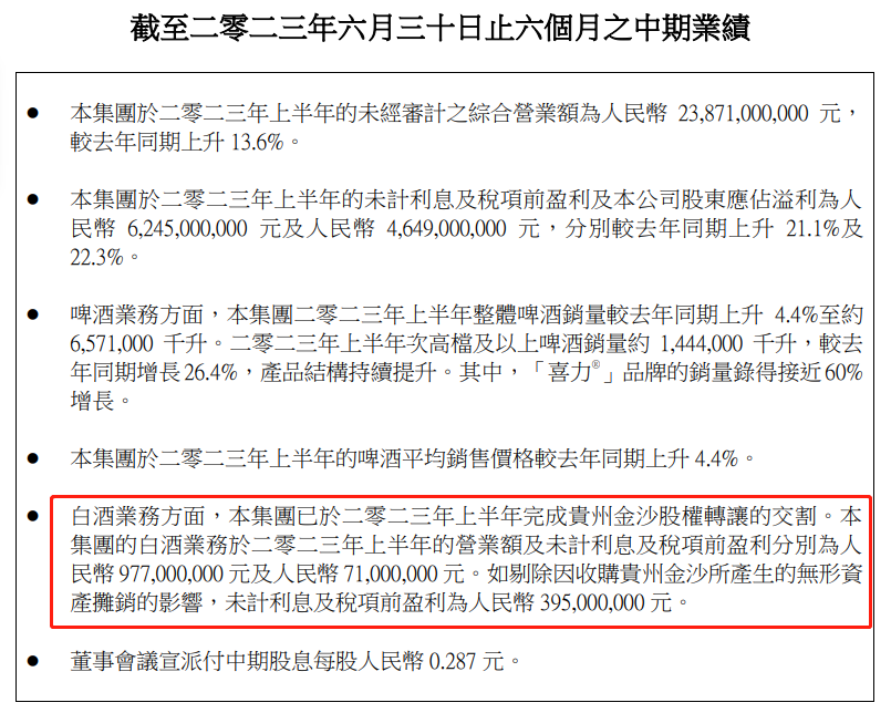财报显示,2023年上半年,华润啤酒的白酒业务共实现营业额9.77亿元,未计利息及税项前盈利为7100万元。如剔除因收购贵州金沙所产生的无形资产摊销的影响,未计利息及税项前盈利为3.95亿元。