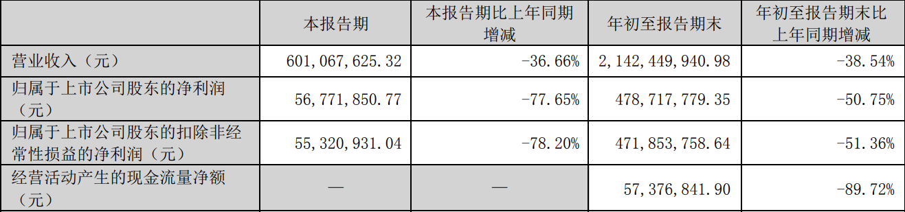 10月27日,酒鬼酒发布第三季度报告,财报显示,前三季度酒鬼酒营业收入21.42亿元,同比下降38.54%;归属于上市公司股东的净利润4.79亿元,同比下降50.75%;单从第三季度来看,酒鬼酒实现营收6.01亿元,同比降38.54%;归属于上市公司股东的净利润0.57亿元,同比降77.65%。