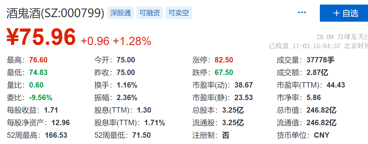 此外,在股价方面,截至11月3日,酒鬼酒股价75.96元/股,成交量37778手,成交额2.87亿元,总市值246.82亿元,虽然股价微增1.28%,但对比52周最高股价166.53元/股,已然腰斩。