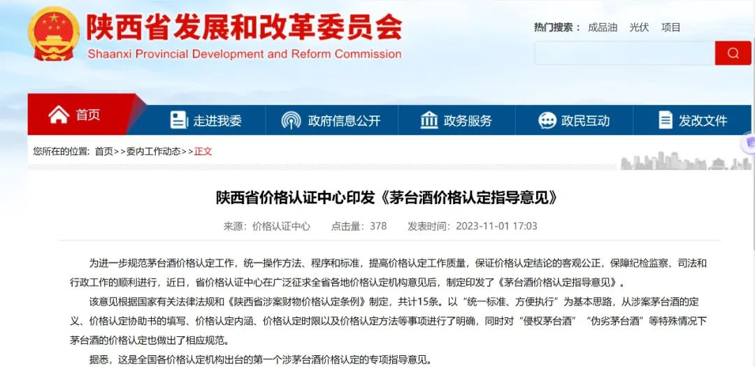 11月7日,据陕西省发展和改革委员会官网显示,陕西省价格认证中心制定印发了《茅台酒价格认定指导意见》。