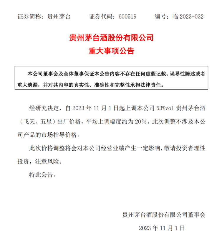 就在指导意见出台的前不久,贵州茅台刚发布公告称,经研究决定,自2023年11月1日起上调53%vol贵州茅台酒(飞天、五星)出厂价格,平均上调幅度约为20%。此次调整不涉及本公司产品的市场指导价格。