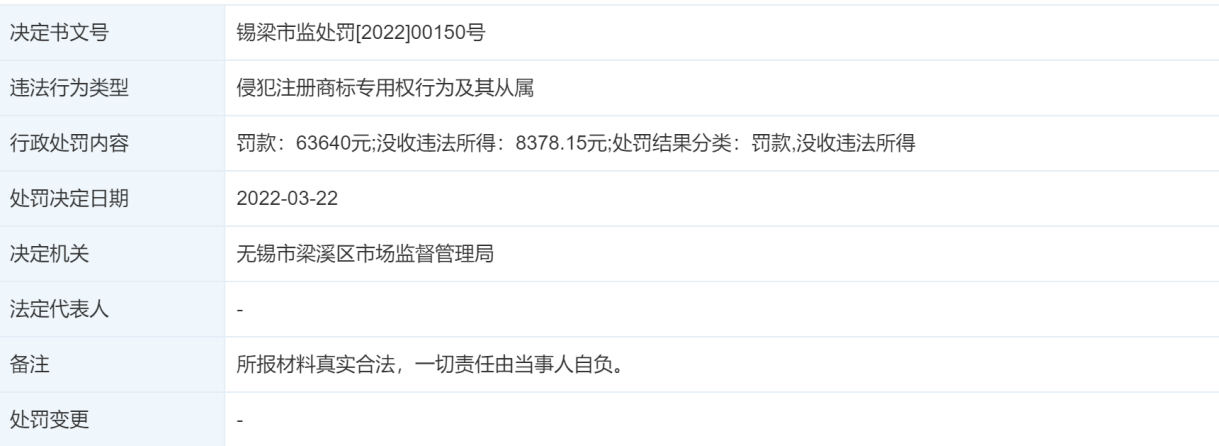 最终被没收违法所得和罚款共计7万余元。决定书文号:锡梁市监处罚(2022)00150号;违法行为类型:侵犯注册商标专用权行为及其从属;处罚决定日期:2022年3月22日;决定机关:无锡市梁溪区市场监督管理局。