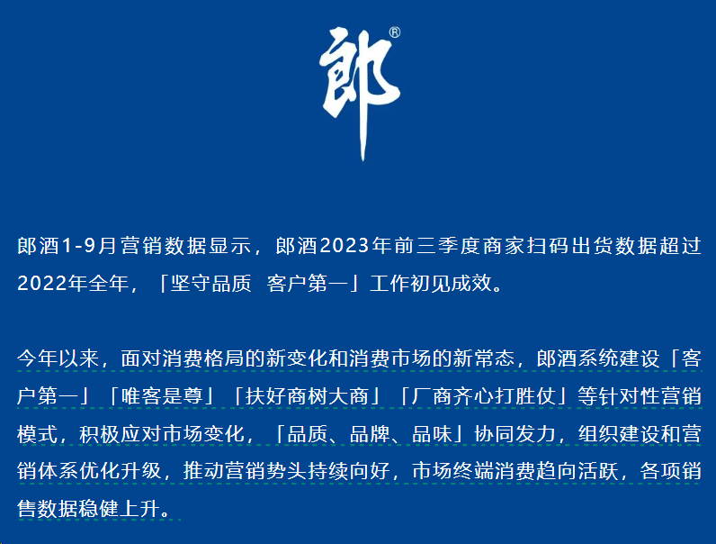 不过,郎酒还是公布了一份不错的“出货成绩单”。前不久,郎酒股份在官方公众号中披露了前三季度扫码出货量。于2023年1-9月份,郎酒2023年前三季度商家扫码出货数据超过2022年全年。