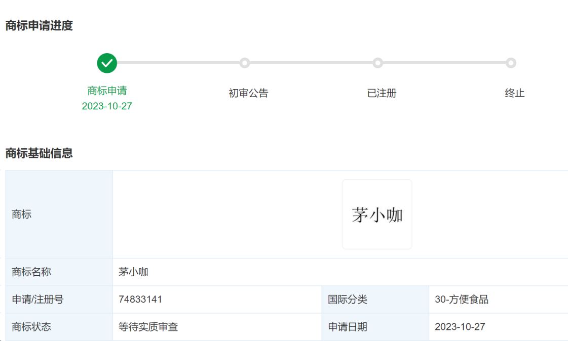 而据天眼查显示,10月27日,茅台再次申请注册“茅小咖”商标,国际分类为30-方便食品,当前商标状态为等待实质审查。