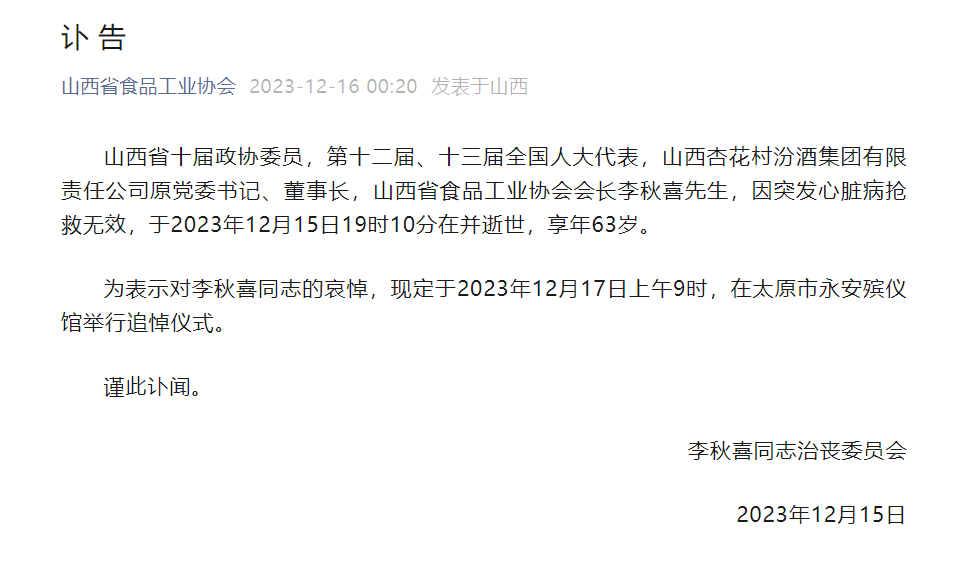 同日,山西省食品工业协会在讣告中表示,山西省十届政协委员,第十二届、十三届全国人大代表,山西杏花村汾酒集团有限责任公司原党委书记、董事长,山西省食品工业协会会长李秋喜先生,因突发心脏病抢救无效,于2023年12月15日19时10分在并逝世,享年63岁。
