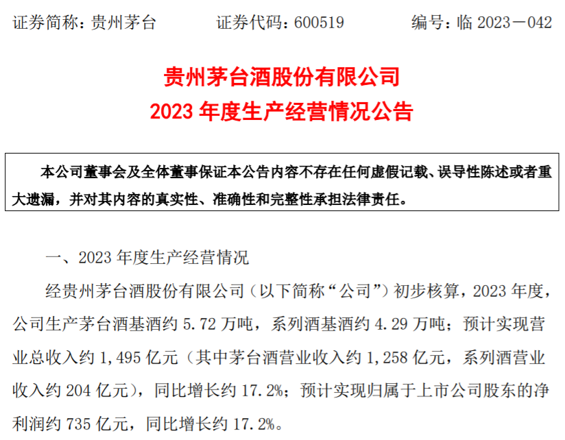 经贵州茅台初步核算,2023年度,公司生产茅台酒基酒约5.72万吨,系列酒基酒约4.29万吨;预计实现营业总收入约1495亿元(其中茅台酒营业收入约1258亿元,系列酒营业收入约204亿元),同比增长约17.2%;预计实现归属于上市公司股东的净利润约735亿元,同比增长约17.2%。