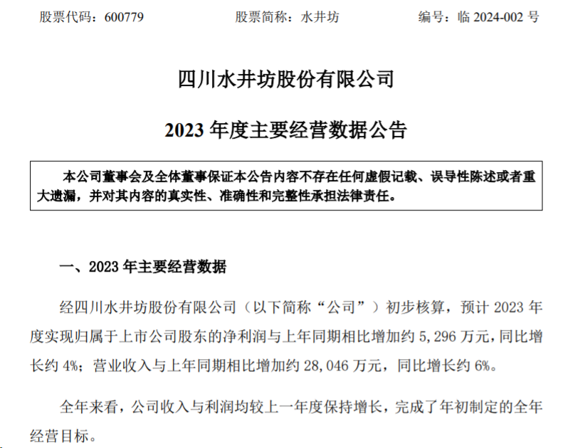 在公告中,水井坊提到,全年来看,公司收入与利润均较上一年度保持增长,完成了年初制定的全年经营目标。