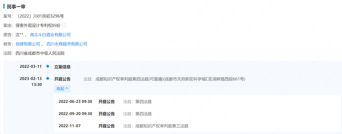 据悉,创始人沈金华已委托律师事务所,将劲牌公司及四川永辉超市有限公司起诉至法院,要求劲牌公司下架相关产品并公开道歉,而成都市中级人民法院也于2022年3月11日受理了该案件。