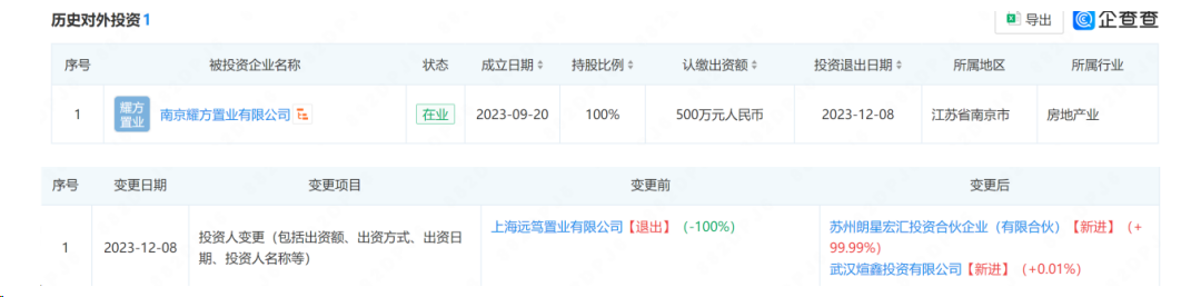 2023年12月8日,上海远笃置业退出南京耀方的投资,同时,同为武汉正煊资本投资有限公司子公司的武汉煊鑫投资有限公司新增持股0.01%。