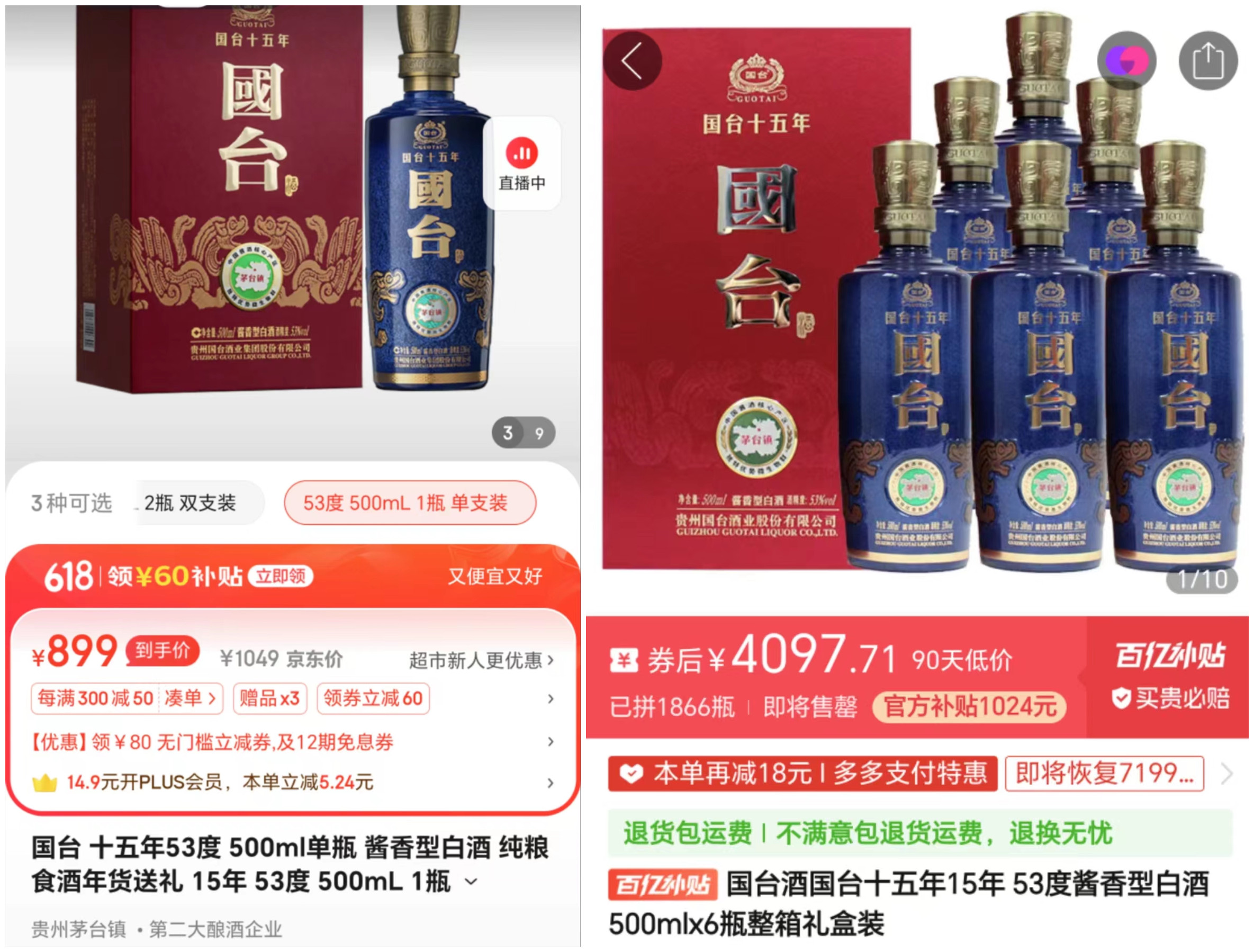官网显示,国台十五年的零售价为1499元/瓶。大公快消查询今日酒价发现,6月12日,上述产品的今日行情仅为610元,价格腰斩。在国台京东官方旗舰店中,国台十五年500ml的售价为899元/瓶。在拼多多平台,上述产品6瓶的整箱礼盒装百亿补贴后的价格为4097.71元,折合682.95元/瓶。