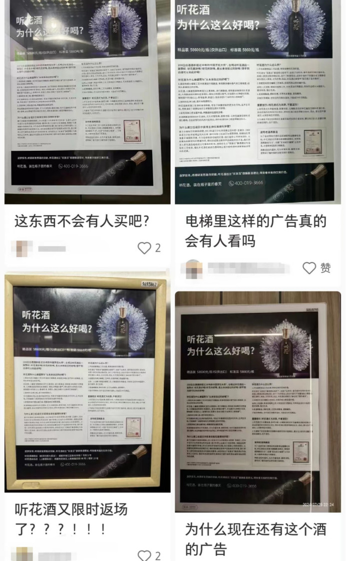 近日,一则名为“听花酒为什么这么好喝?”的电梯广告,吸引了广大网友的注意。对此,有网友在小红书发布笔记表示“为什么还有这个酒的广告”“听花酒又限时返场了”“电梯里这样的广告真的会有人看吗”......