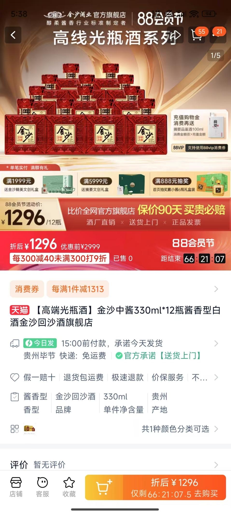 通过搜索金沙回沙酒天猫官方旗舰店可以看到,目前上述新品除了“金沙小酱”在售外,另外在售的还有金沙光瓶酒系列的高线光瓶酒系列,但该产品价格同样大打折扣。在该店铺中,“金沙中酱330ml*12瓶高端光瓶酒”原价为2999元,折后价为1296元,相当于打了4.3折。更值得注意的是,该款产品销售数量为0。