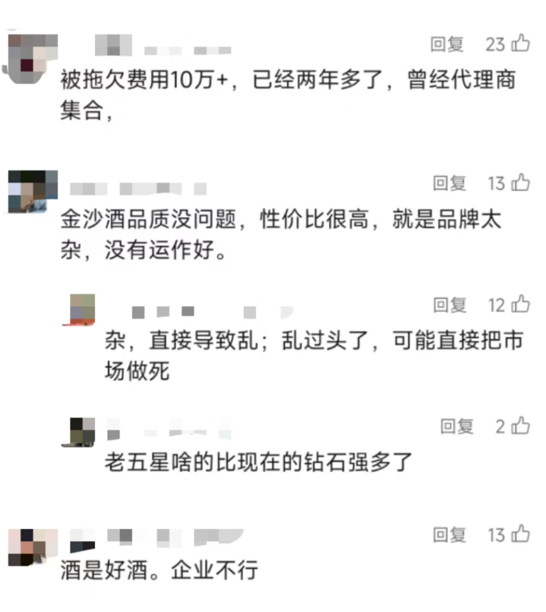 在业绩表现不佳、产品价格倒挂严重等问题下,金沙酒的经销商们也开始“抱怨”了。有网友表示自己曾经是金沙酒的代理商,被拖欠了十几万的费用。也有网友坦言“金沙酒品质没问题,性价比很高,就是品牌太杂,没有运作好”。