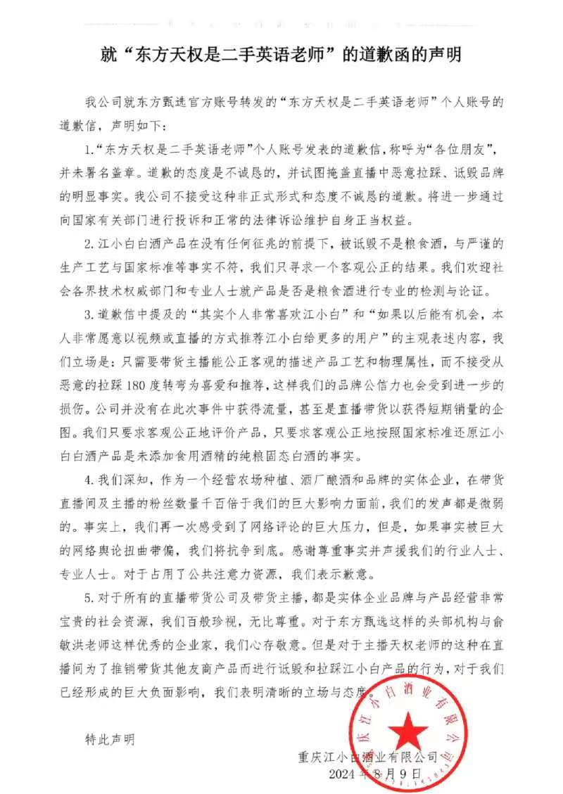 江小白表示,“东方天权是二手英语老师”个人账号发表的道歉信,称呼为“各位朋友”,并未署名盖章。道歉的态度是不诚恳的,并试图掩盖直播中恶意拉踩、诋毁品牌的明显事实。我公司不接受这种非正式形式和态度不诚恳的道歉。将进一步通过向国家有关部门进行投诉和正常的法律诉讼维护自身正当权益。”