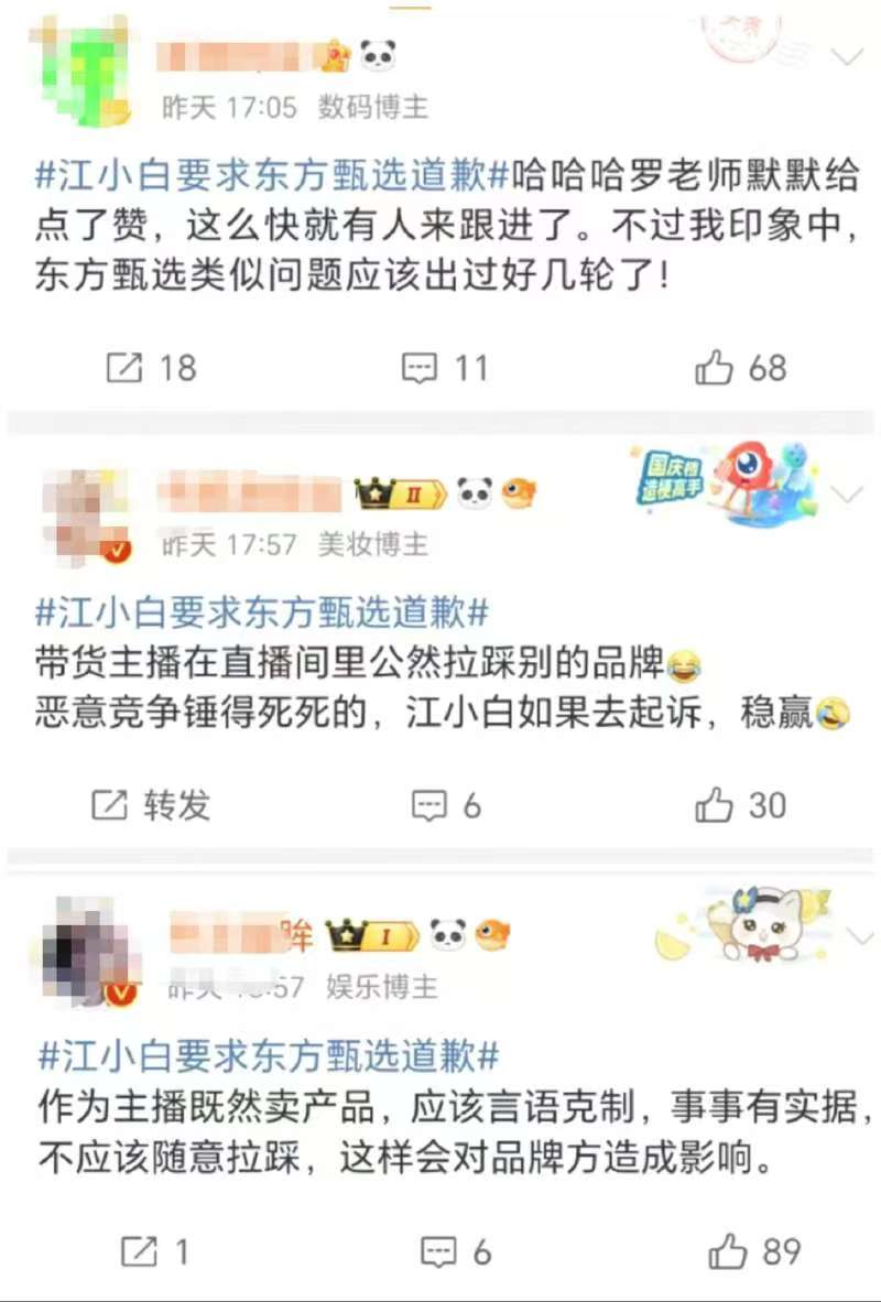 针对此事,有微博博主表示,“作为主播既然卖产品,应该言语克制,事事有实据,不应该随意拉踩,这样会对品牌方造成影响。”