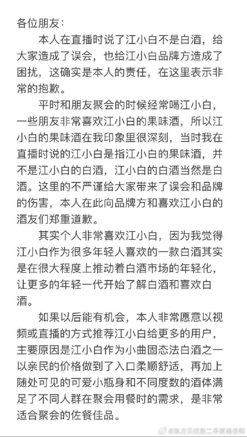在东方甄选致歉之前,主播天权在其个人账号发表道歉信称,他在直播时说了江小白不是白酒,给大家造成了误会,也给江小白品牌方造成了困扰,这确实是他的责任,表示非常的抱歉。