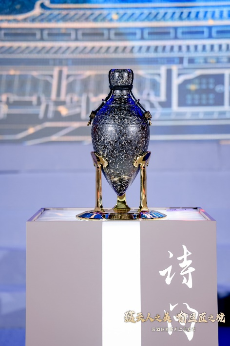 “御载”记录了清中叶被《四库全书》收录的中国白酒名垂青史的盛会:“中国汾酒诗会”。宝石釉酒器以天然海蓝宝石为釉,海水江崖双龙赶珠纹与回型纹相互交织。非遗木盒还原王艺《水系列》作品,非遗大漆工艺描摹中国山水的流动飘逸。