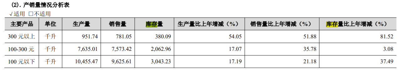 财报显示,2023年金徽酒300元以上商品生产量为951.74千升,同比增长54.05%;销售量为781.05千升,同比增长51.88%;库存量380.09千升,同比增长81.52%。在2022年,金徽酒将商品分为高中低三档,这三档商品库存量增速均位于高位,分别同比增长90.04%、83.71%、69.84%。