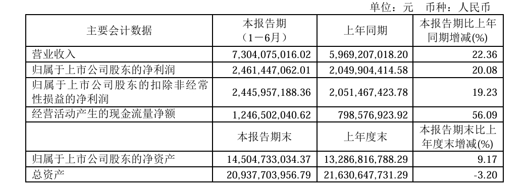 近日,今世缘披露了2024年半年度业绩报告。2024年上半年,公司实现营收73.04亿元,同比增长22.36%;归属于上市股东的净利润24.61亿元,同比增长20.08%;经营活动产生的现金流量净额为12.47亿元,同比增长56.09%。