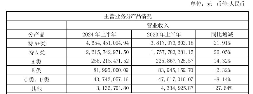 从产品来看,报告期内,今世缘特A+类、特A类以及A类产品分别实现营收46.54亿元、22.16亿元、2.58亿元,同比提升21.91%、26.05%、14.32%。相比之下,今世缘低端酒表现并不出彩,B类、C类、D类产品营收均出现不同程度的下滑。