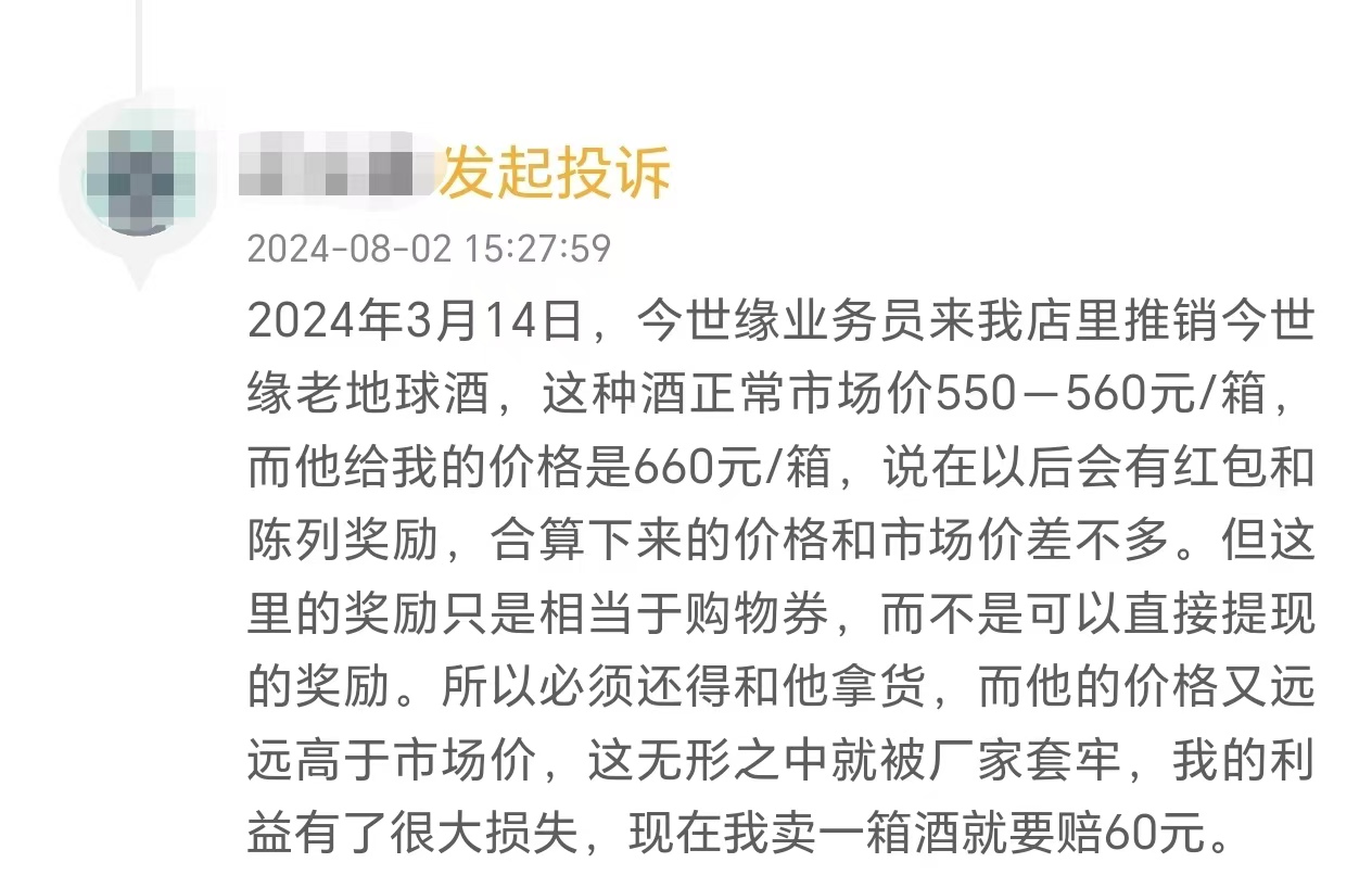 有店主在黑猫投诉平台投诉表示,2024年3月14日,今世缘业务员来店里推销今世缘老地球酒,这种酒正常市场价550-560元/箱,而他(今世缘业务员)给的价格是660元/箱,说以后会有红包和陈列奖励,但这里的奖励只是相当于购物券,所以还得继续和他拿货,但他的价格又远远高于市场价,“现在我卖一箱酒就要赔60元”。