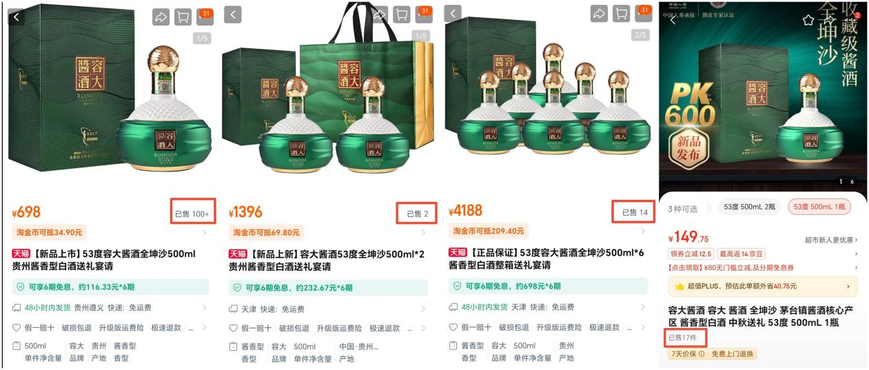 在容大天猫旗舰店中,容大酱酒(全坤沙)单瓶装的销量超100件,双瓶装的销量为2件,整箱装(6瓶)的销量为14件,而在酒仙网天猫旗舰店中并未上架此产品。在酒仙网京东旗舰店,容大酱酒(全坤沙)单瓶装的销量仅为17件,销量低迷。