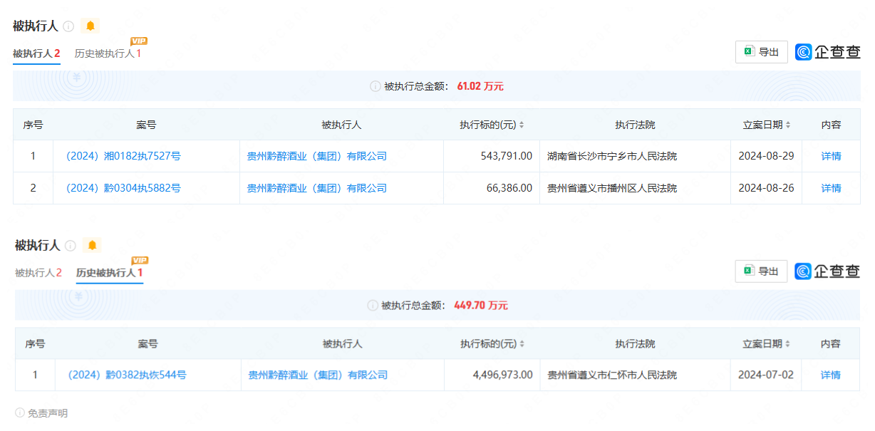 容大酱酒的生产厂家为贵州黔醉酒业(集团)有限公司(以下简称“黔醉酒业”)。企查查显示,黔醉酒业曾多次成为被执行人,2024年7月2日至2024年8月29日期间,被执行总金额超510万元。