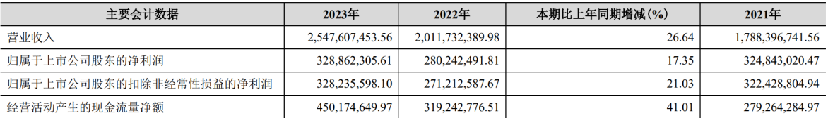 2022年、2023年,金徽酒营业收入约为20.11亿元、25.47亿元;归属于上市公司股东的扣除非经常性损益的净利润约为2.71亿元、3.28亿元。