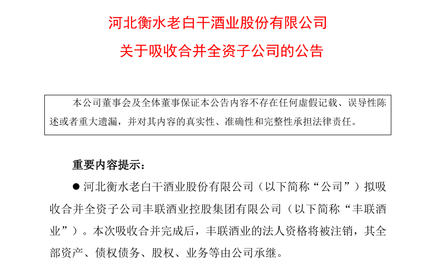 10月10日,河北衡水老白干酒业股份有限公司(以下简称“老白干酒”)发布公告,公司拟吸收合并全资子公司丰联酒业控股集团有限公司(以下简称“丰联酒业”)。本次吸收合并完成后,丰联酒业的法人资格将被注销,其全部资产、债权债务、股权、业务等由老白干酒承继。