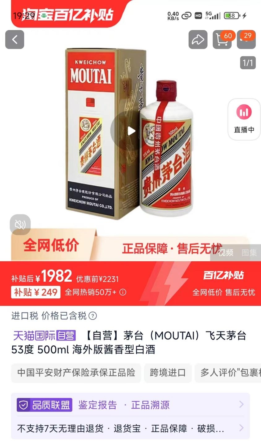 近期,“飞天茅台跌破2000元”成为白酒行业最大的话题。目前,在淘宝“百亿补贴”活动力度下,单瓶53度500ml装的海外版飞天茅台售价仍然低于2000元,即1982元/瓶。为此,贵州茅台紧急采取了控量稳价的措施,这使得飞天茅台的价格有所回升。