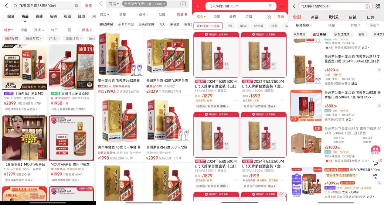 与此同时,在抖音、淘宝、拼多多等平台,不少店铺售卖的飞天茅台价格优惠后仅2000元左右。11月8日,大公快消在抖音、拼多多、淘宝、京东搜索“飞天茅台53度500ml”产品,单瓶价格在1700元-2500元不等。