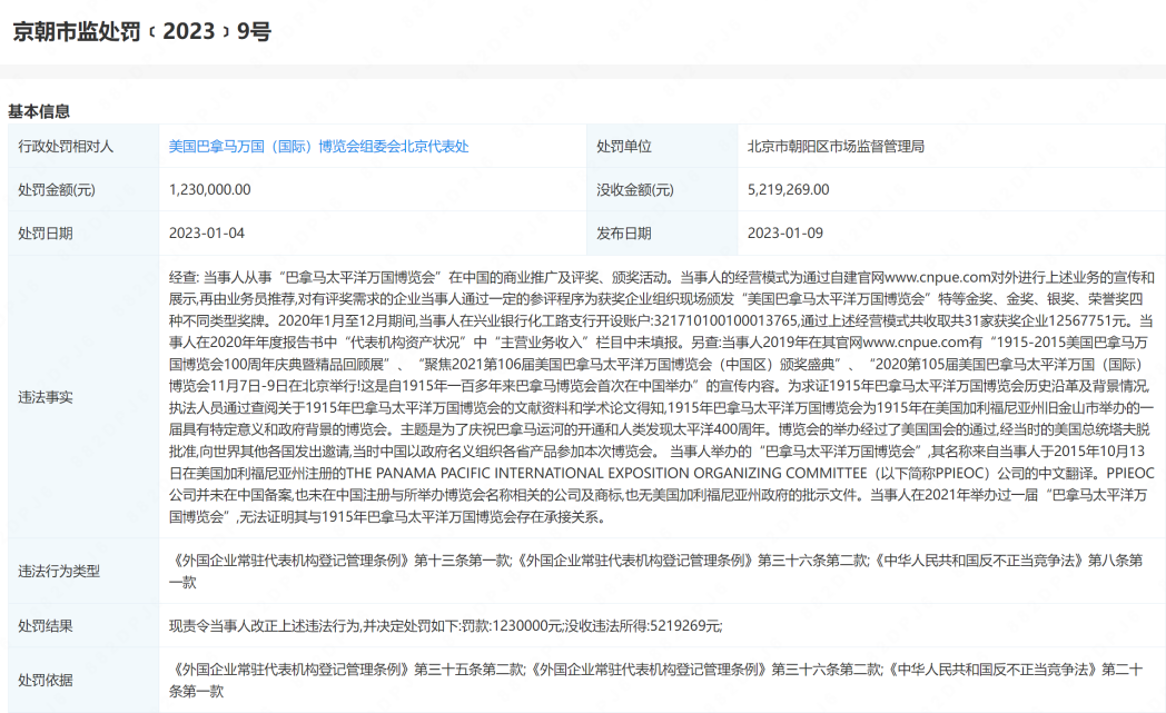 据企查查显示,去年1月4日,美国巴拿马万国(国际)博览会组委会北京代表处,就曾被北京市朝阳区市场监督管理局作出罚款123万元、没收违法所得521万元左右的行政处罚。