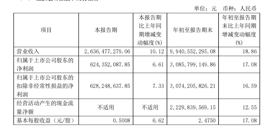 公告显示前三季度,今世缘实现营业收入约为99.4亿元,同比增长18.86%;归属于上市公司股东的净利润约为30.9亿元,同比增长17.08%。