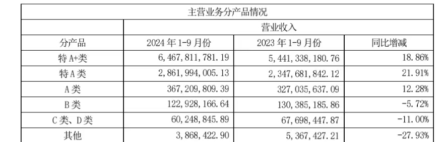 分产品看,前三季度今世缘特A+类产品实现营收约为64.7亿元,同比增长18.86%;特A类产品实现营收约为28.6亿元,同比增长21.91%;A类产品实现营收约为3.7亿元,同比增长12.28%;B类产品实现营收约为1.2亿元,同比下降5.72%;其他产品实现营收约为0.6亿元,同比下降12.25%。