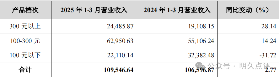 从产品档次分类情况看,2025年第一季度,以金徽年份系列、金徽老窖系列为主的300元以上产品营收约为2.45亿元,同比增长28.14%左右;以柔和金徽系列、金徽正能量系列、世纪金徽五星为主100元-300元产品营收约为6.30亿元,同比增长14.24%左右;以世纪金徽四星、世纪金徽三星、世纪金徽二星、金徽陈酿等为主的100元以下产品营收约为2.21亿元,同比降低31.72%左右。