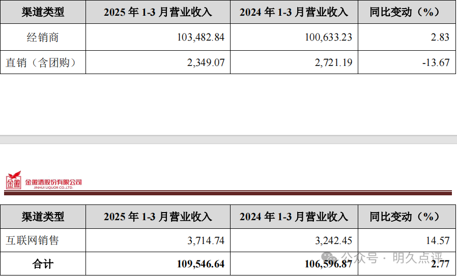 另外,2025年第一季度,金徽酒来自经销商、直销(含团购)和互联网的营收分别约为10.34亿元、2349万元和3714万元,前者增长2.835%,中者下13.67%左右,后者增长14.57%左右。