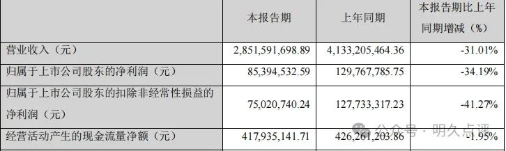 4月25日收盘之后,华致酒行发布了2025年一季报,第一季度,华致酒行实现营业收入约28.52亿元,同比减少约31%;归属于上市公司股东净利润约8539万元,同比减少约34%。