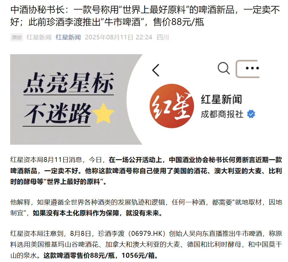 据红星资本局报道,近日,在一场公开活动上,中国酒业协会秘书长何勇断言近期一款啤酒新品,一定卖不好。他称这款啤酒号称自己使用了美国的酒花、澳大利亚的大麦、比利时的酵母等“世界上最好的原料”。他解释,如果遵循全世界各种酒类的发展轨迹和逻辑,任何一种酒,都需要“就地取材,因地制宜”,“如果没有本土化原料作为保障,我想它是不可能有未来”。