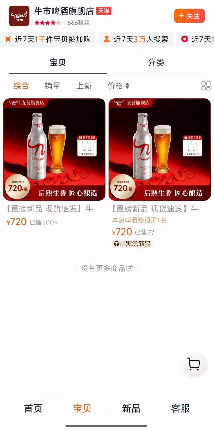 大公快消查询淘宝平台,目前,已有牛市啤酒旗舰店,该店铺仅有2款产品链接,均为“牛市啤酒精酿5.5度375ml*12瓶”,价格为720元。截至2025年8月16日19:20,两个链接销量分别为200+、77。