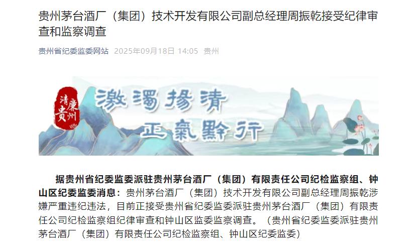 大公快消讯 9月18日,据贵州省纪委监委消息,贵州茅台酒厂(集团)技术开发有限公司副总经理周振乾涉嫌严重违纪违法,目前正接受贵州省纪委监委派驻贵州茅台酒厂(集团)有限责任公司纪检监察组纪律审查和钟山区监委监察调查。