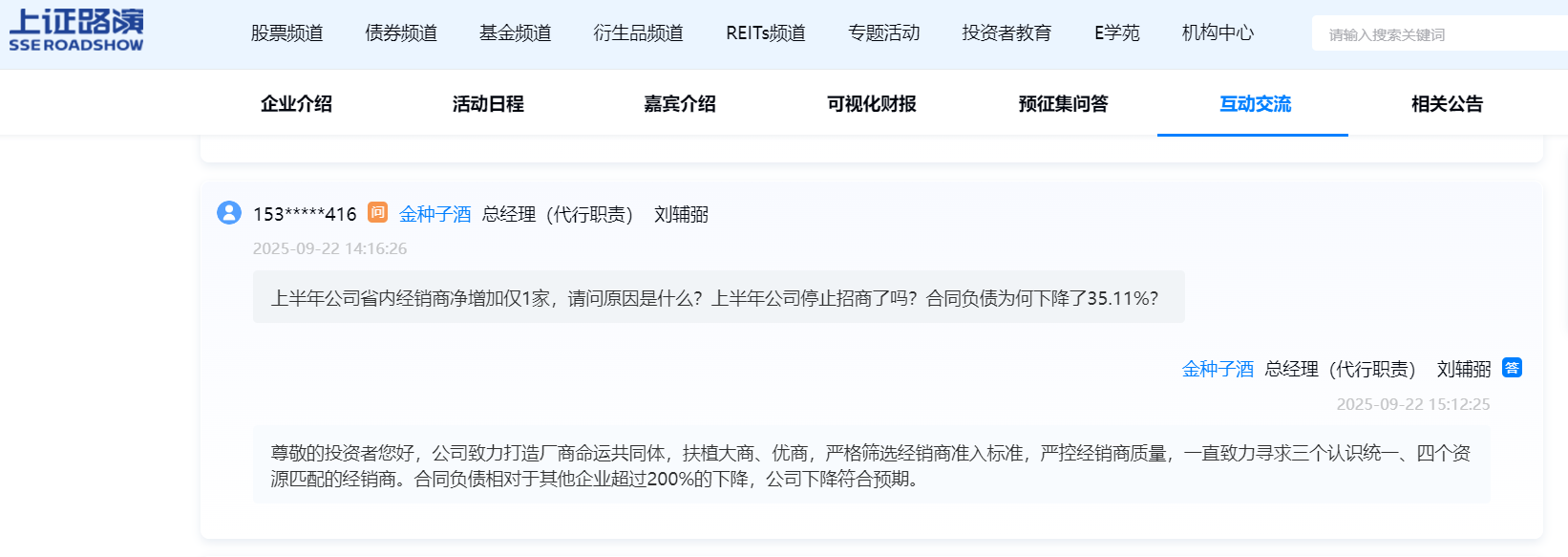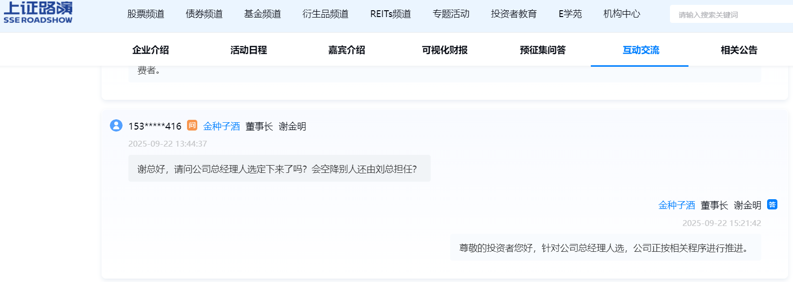 大公快消讯 9月22日下午,安徽金种子酒业股份有限公司(以下简称:金种子酒)在上证路演中心平台进行2025年半年度业绩说明会,董事长谢金明、副总经理(代行总经理职责)刘辅弼、独立董事樊勇以及董事会秘书金彪等多位高管参加本次业绩说明会。