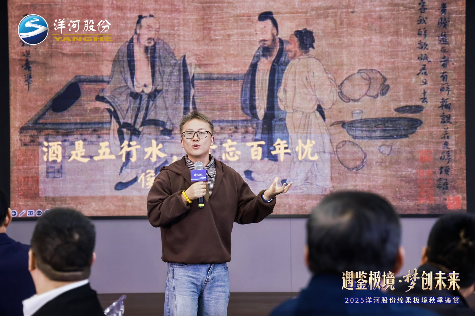 一场融合汉、唐、明、清四代酒礼的礼仪表演,生动复现中国酒礼流变;洋河特色酒具“天地杯”“成事盏”“立心壶”与圆梦酒礼也通过酒道表演一一呈现。著名文化学者、艺术评论家纪太年在主题分享《酒礼演变、品牌国宴故事回顾》中,深入解读了中国酒礼文化的传承与创新。
