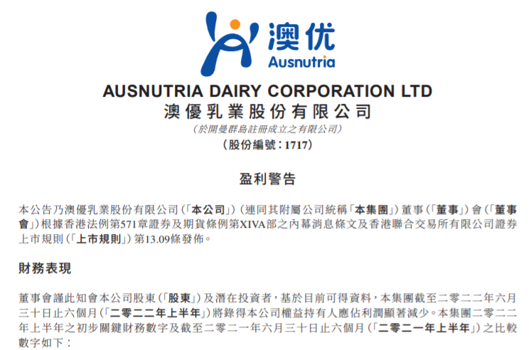 大公快消讯 7月4日,澳优乳业股份有限公司发布盈利警告。公告称,基于目前可得资料,集团截至2022年6月30日止六个月将录得公司权益持有人应占利润显著减少。