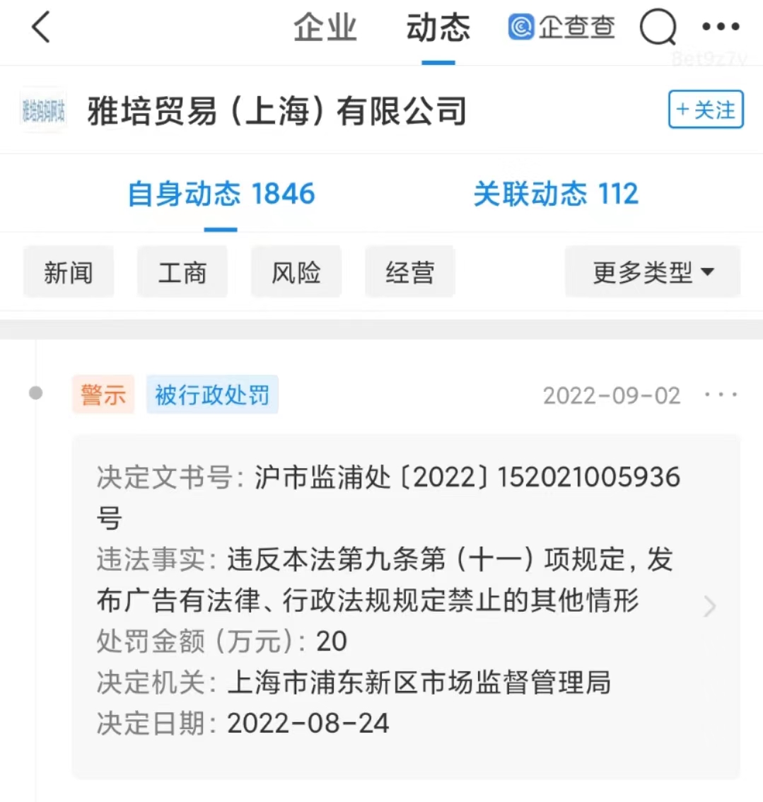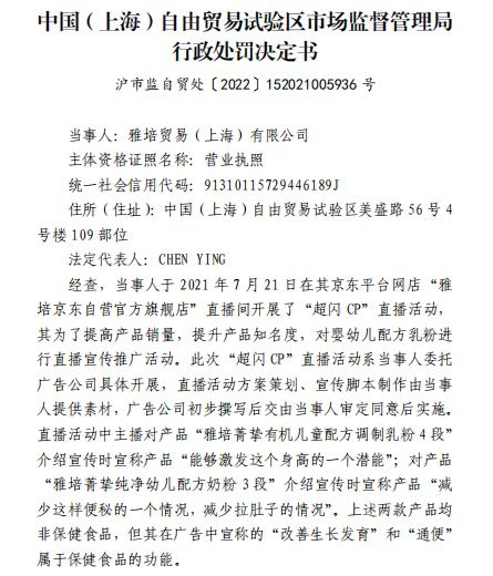 据上海市市场监督管理局官网发布的行政处罚决定书显示,雅培贸易(上海)有限公司于2021年7月21日在其京东平台网店“雅培京东自营官方旗舰店”直播间开展了“超闪CP”直播活动,为了提高产品销量,提升产品知名度,对婴幼儿配方乳粉进行直播宣传推广活动。