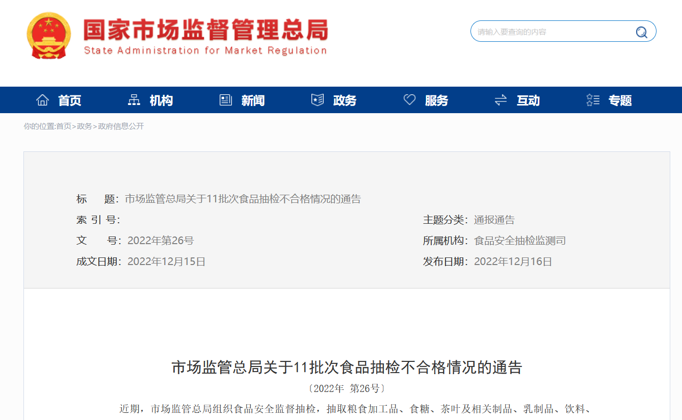 大公快消讯 近日,国家市场监督管理总局发布关于11批次食品抽检不合格情况的通告〔2022年第26号〕,涉及婴幼儿配方食品添加剂超范围超限量使用问题。