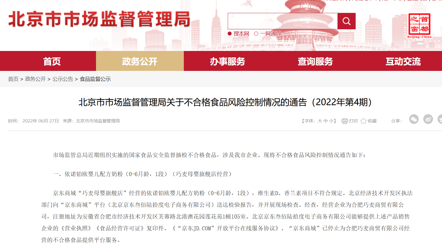 通告情况显示,京东巧麦母婴旗舰店(经营者为安徽省合肥巧麦商贸有限公司)在京东商城(网店)销售的、标称江苏省常州市千家万铺商贸有限公司中国总经销的、AlterFarmacia,S.A.(原产国:西班牙)生产的依诺铂欧婴儿配方奶粉(0—6月龄,1段,800克/罐,Nutribén,2021/4/14,保质期至:2023/04/14),其中香兰素检测值不符合食品安全国家标准规定、维生素D含量不符合产品标签标识要求。