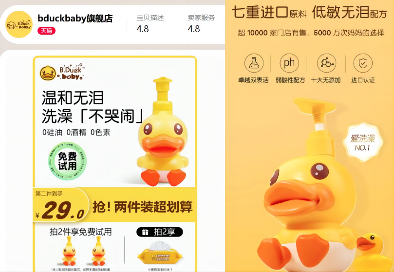 但大公快消注意到,被检验的14款产品中,B.DUCKBABY洗发沐浴露,在其线上销售页面也多显示"无泪配方"、"温和"、"低敏"等宣称,但试验结果不仅不是无刺激性,还是刺激性等级最强的,与其广告宣称截然相反。